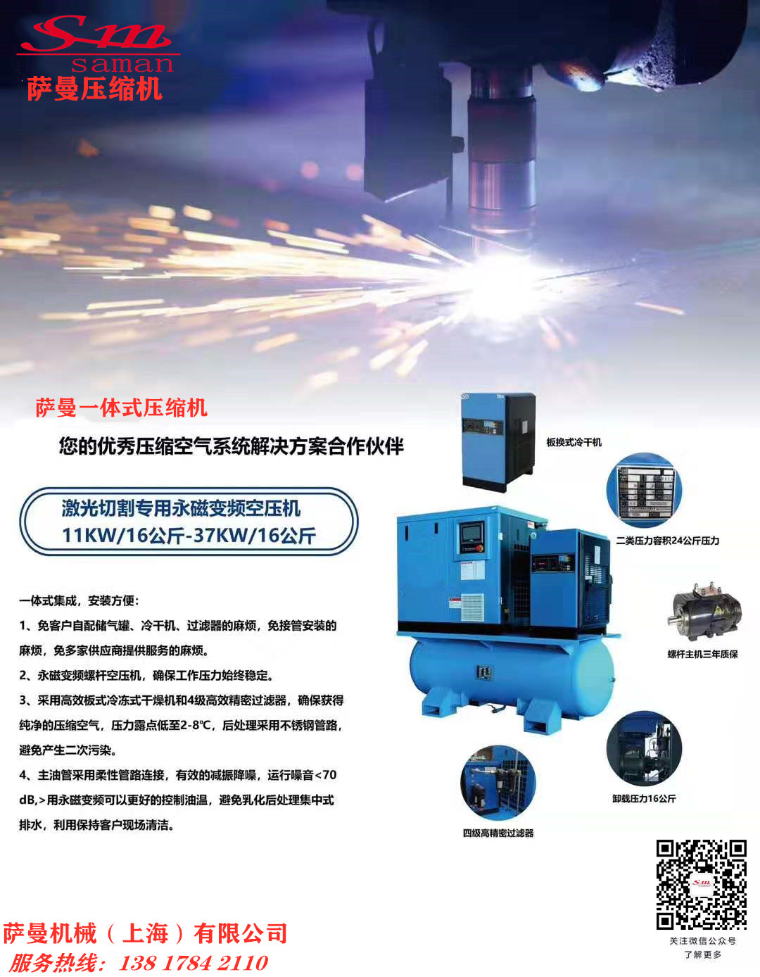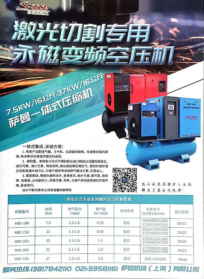 激光切割專用螺桿空壓機 激光切割空壓機 激光切割用16公斤永磁空壓機 16公斤螺桿空壓機 16公斤激光用永磁空壓機上海薩曼組合式一體永磁 螺桿式空壓機安裝簡單 運行方便產(chǎn)品出廠時,機器中已加滿壓縮機油,若安裝就位后,接通電源,即可投入運行。通過帶背光的液晶屏幕,清晰地顯示機器的運行狀態(tài)。節(jié)省空間安全環(huán)保產(chǎn)品結(jié)構(gòu)緊湊,體積小,占地面積少,加之運行噪聲低,因此可安裝在任何需要的地方,即使是生產(chǎn)區(qū)域也無妨礙。降低成本節(jié)約能耗使用智能控制系統(tǒng)和全自動加載/卸載調(diào)節(jié),可保證空壓機根據(jù)壓縮空氣的需求量運行,杜絕浪費,不用氣時自動停機,降低機器的運行成本,減少能源消耗,效果顯著。